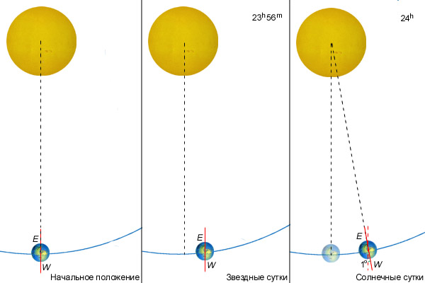 Выберем любую звезду и зафиксируем ее положение на небе. На том же самом месте звезда появится через сутки, точнее через 23 часа 56 минут. Сутки, измеренные относительно далеких звезд, называются звездными (если быть совсем точными, звездные сутки – промежуток времени между двумя последовательными верхними кульминациями точки весеннего равноденствия). Куда же деваются еще 4 минуты? Дело в том, что вследствие движения Земли вокруг Солнца оно смещается для земного наблюдателя на фоне звезд на 1° за сутки. Чтобы «догнать» его, Земле и нужны эти 4 минуты.