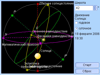 В средних широтах на протяжении года видимый суточный путь Солнца то сокращается, то увеличивается. Наименьшим он будет в день зимнего солнцестояния (приблизительно 22 декабря), наибольшим – в день летнего солнцестояния (приблизительно 22 июня). В дни весеннего и осеннего равноденствий (соответственно 21 марта и 23 сентября) продолжительность дня равна продолжительности ночи, т.к. Солнце находится на небесном экваторе: оно восходит в точке востока и заходит в точке запада.