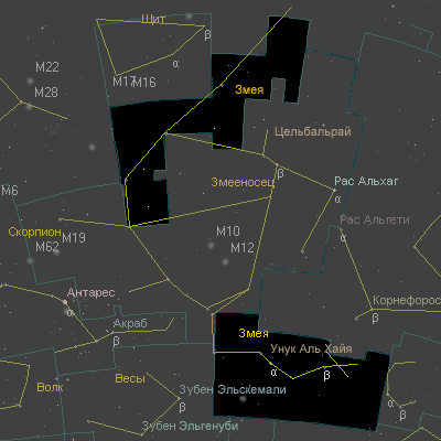 Созвездие Змеи состоит из двух частей: «Головы» и «Хвоста», не связанных между собой. Они лежат по обе стороны созвездия Змееносец.