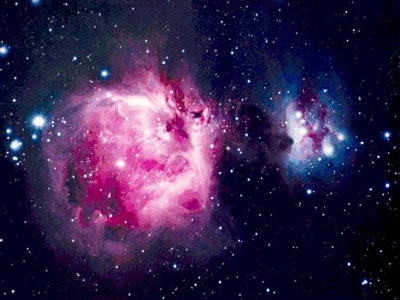 Под Поясом Ориона можно найти светлую газопылевую туманность М42 (NGC 1976) – Большую туманность Ориона, ее интегральный блеск 4,0m. Невооруженным глазом туманность видна как неприметное маленькое пятнышко, похожее на комету. В телескоп же туманность предстает во всей своей красе. В центре туманности можно увидеть четыре горячие звезды – Трапецию Ориона. Вокруг Трапеции Ориона – область активного звездообразования, которая состоит из сверхплотного молодого скопления звезд и переменных типа Т Тельца. Рядом расположены плотные молекулярные облака, это ближайшие к Солнцу ГМО – гигантские молекулярные облака Орион А и Орион В, расстояние до них 400–500 пк.