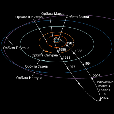 Орбиты большинства комет – сильно вытянутые эллипсы. В 1702 году Эдмунд Галлей доказал, что кометы 1531, 1607 и 1682 годов имеют одну и ту же орбиту. Оказывается, кометы возвращаются! Период обращения вокруг Солнца кометы Галлея 76 лет, большая полуось орбиты 17,8 а. е, эксцентриситет 0,97, наклонение орбиты к плоскости эклиптики 162,2°, расстояние в перигелии 0,59 а. е. Последняя дата прохождения перигелия – 1986 год. В 2000 году комета Галлея находится между орбитой Урана и Нептуна. Афелий орбиты кометы Галлея находится далеко за орбитой Нептуна.